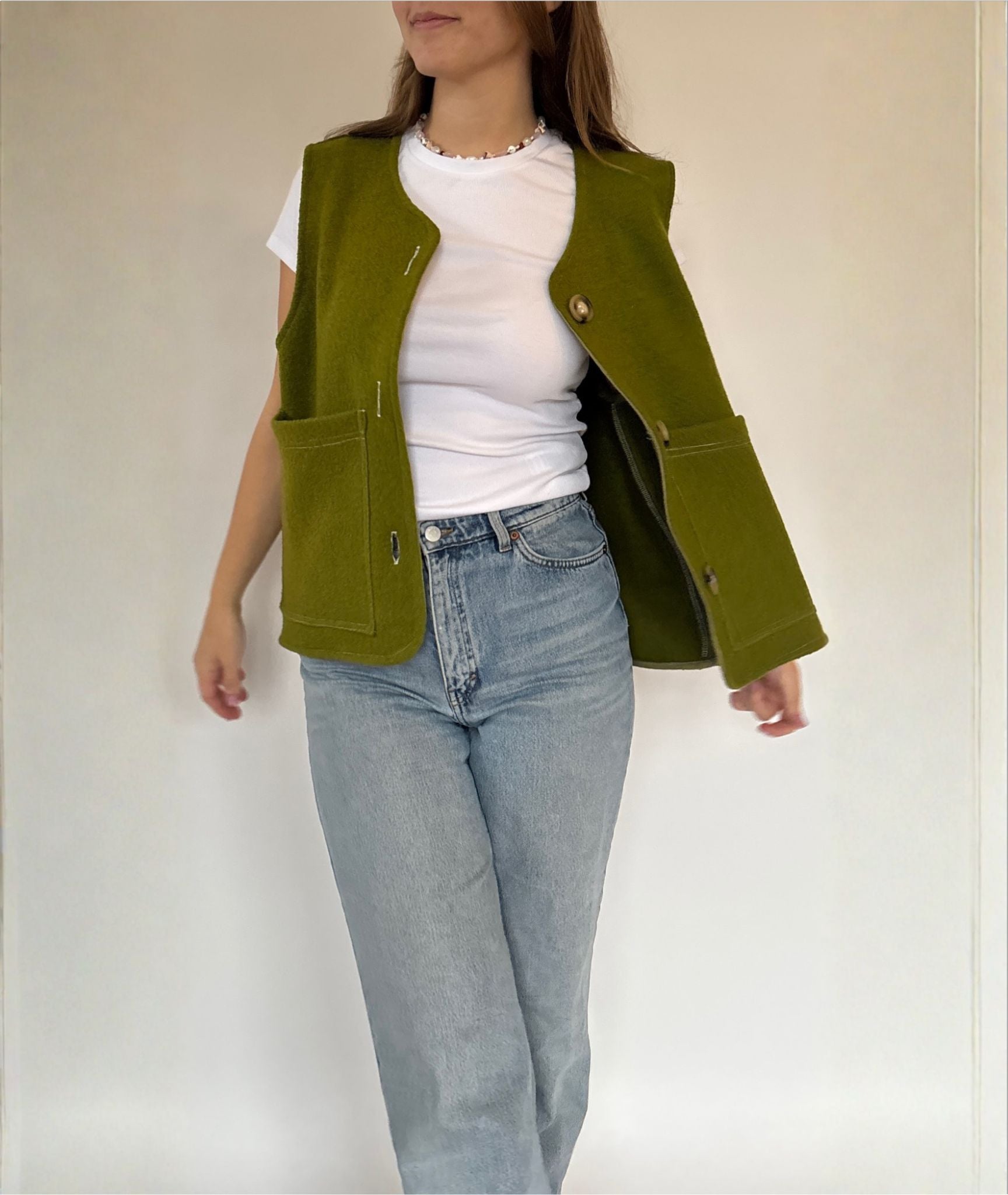 Meet our new Field Vest — boxy, warm, and built to layer. Handmade from 100% boiled wool with deep front patch pockets and oversized tortoiseshell buttons. A soft, structured layer to throw on over tees, knits, or whatever you’re already wearing.