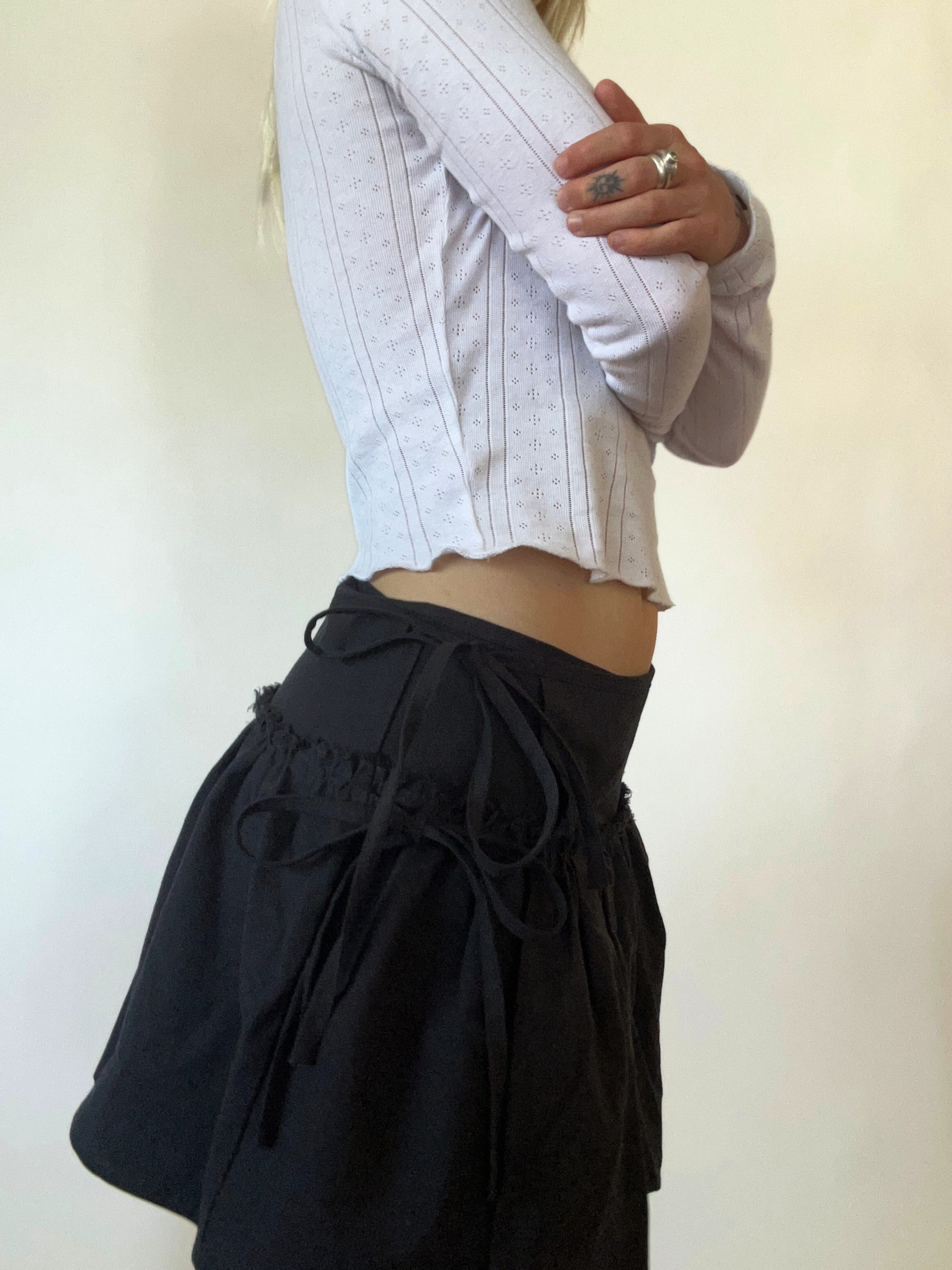 The Wells Wrap Skirt is an adjustable wrap skirt with two side ties and a gathered lower tier. A structured yoke and exposed seam detailing give it shape while keeping the fit easy and flexible.