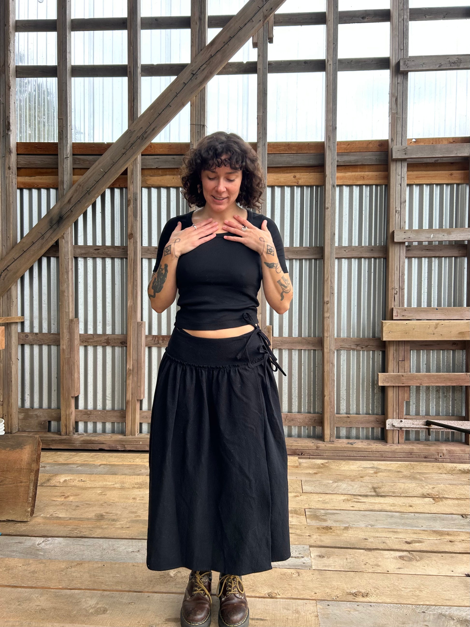 The Wells Wrap Skirt is an adjustable wrap skirt with two side ties and a gathered lower tier. A structured yoke and exposed seam detailing give it shape while keeping the fit easy and flexible.